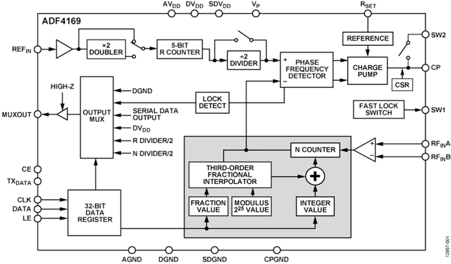 所有片內(nèi)寄存器均通過簡單的三線式接口進行控制。 ADF4169采用2.7 V至3.45 V模擬電源和1.8 V至2.0 V數(shù)字電源供電,不用時可以關(guān)斷。