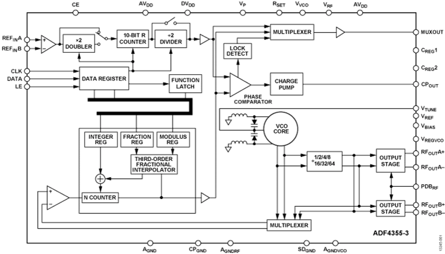 所有片內(nèi)寄存器均通過簡(jiǎn)單的三線式接口進(jìn)行控制。 ADF4355-3采用3.15 V至3.45 V的模擬、數(shù)字、電荷泵和VCO電源工作。此外,ADF4355-3還內(nèi)置硬件和軟件省電模式。