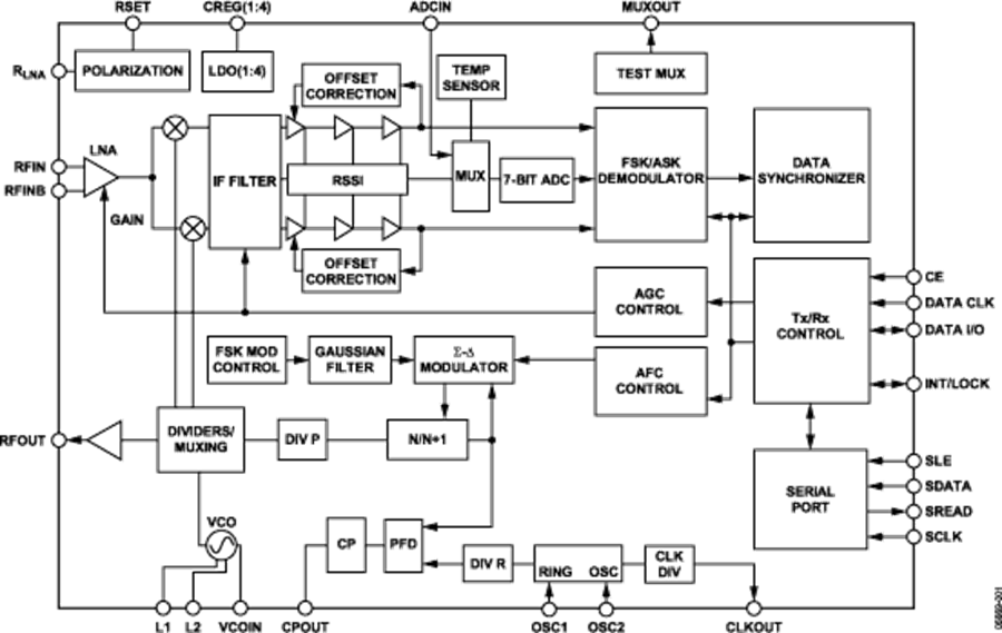 發(fā)射機(jī)輸出功率可在?16 dBm到+13 dBm之間以0.3 dB步長(zhǎng)精度進(jìn)行編程設(shè)置。收發(fā)器射頻頻率、通道間隔和調(diào)制都可以利用簡(jiǎn)單的三線(xiàn)式接口來(lái)編程。該器件采用2.3 V至3.6 V電源供電,支持關(guān)斷功能。