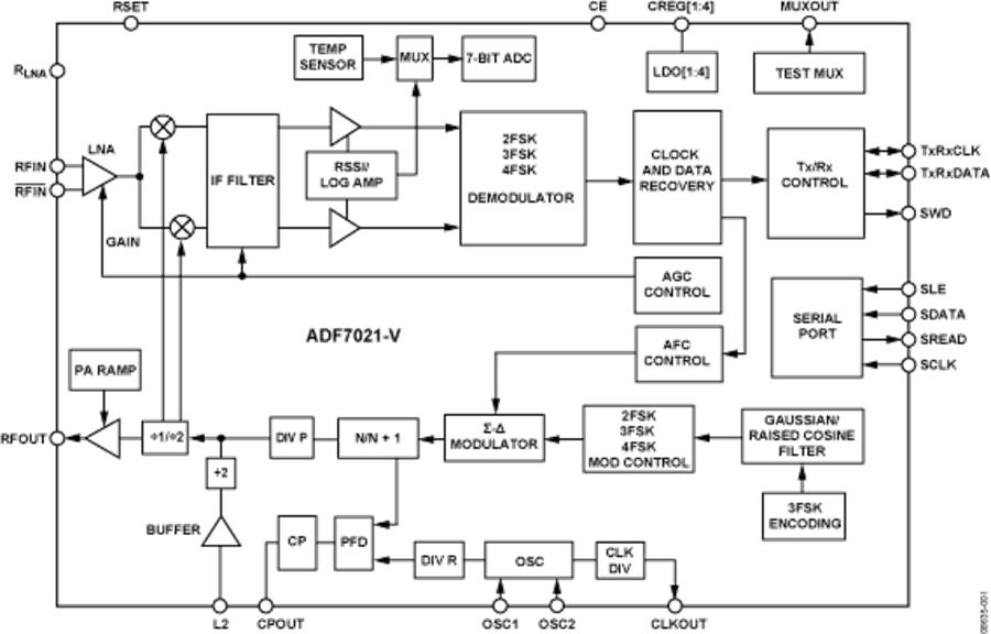 ADF7021-V只需少量外部分立器件便可構(gòu)建一個(gè)完整的收發(fā)器,因此非常適用于區(qū)域敏感且注重高性能的應(yīng)用。