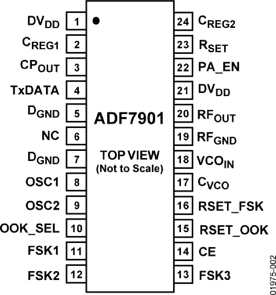 ADF7901是一款低功耗OOK/FSK UHF發(fā)射機,設計用于RF遙控器件。該器件能夠對八個不同通道執(zhí)行頻移鍵控(FSK)調制,通道可通過三條外部控制線路來選擇。OOK調制通過調制PA控制線路執(zhí)行。片內VCO的工作頻率為輸出頻率的兩倍。VCO輸出端的二分頻操作可減少PA饋通量,因此很容易實現大于50 dB的OOK調制深度。