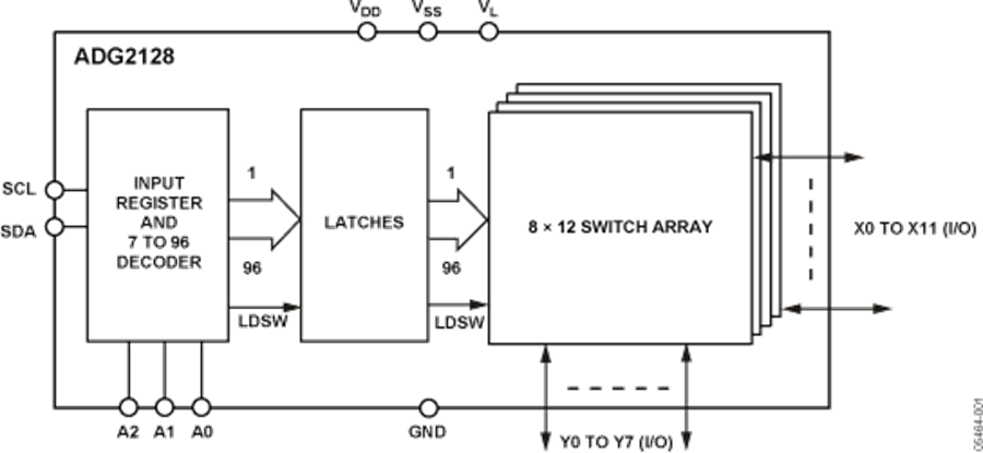 ADG1438: ±15 V/+12 V/±5 V, Single 8 to 1 Multiplexer, Serially Controlled Matrix Switch The ADG1438 and ADG1439 are CMOS analog matrix switches with a serially controlled 3-wire interface. The ADG1438 is an 8-chan