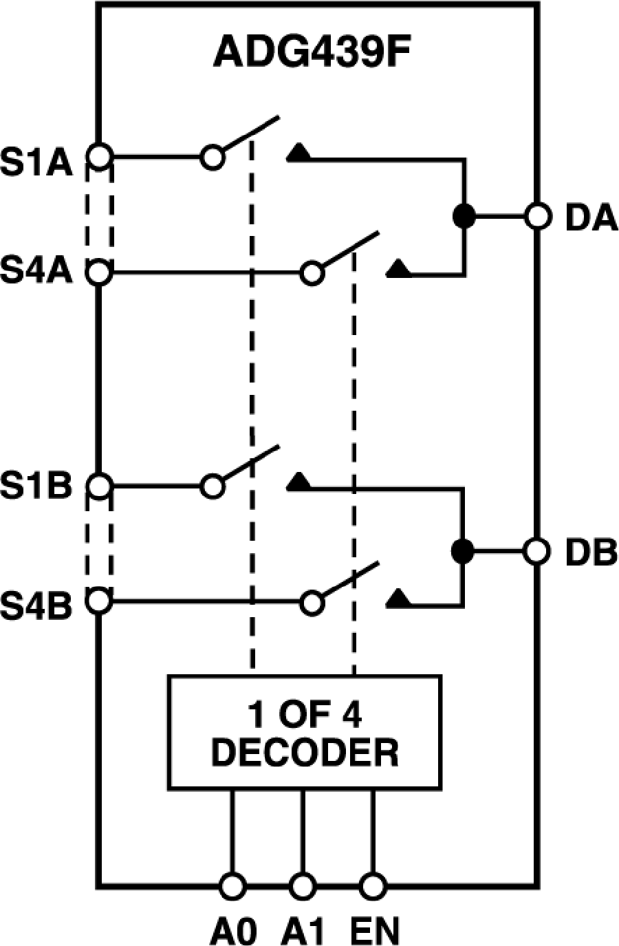 ADG438F根據(jù)3位二進(jìn)制地址線A0、A1和A2所確定的地址,將8路輸入之一切換至公共輸出。ADG439F根據(jù)2位二進(jìn)制地址線A0和A1所確定的地址,將4路差分輸入之一切換至公共差分輸出。各器件均提供EN輸入,用來使能或禁用器件。禁用時,所有通道均關(guān)斷。