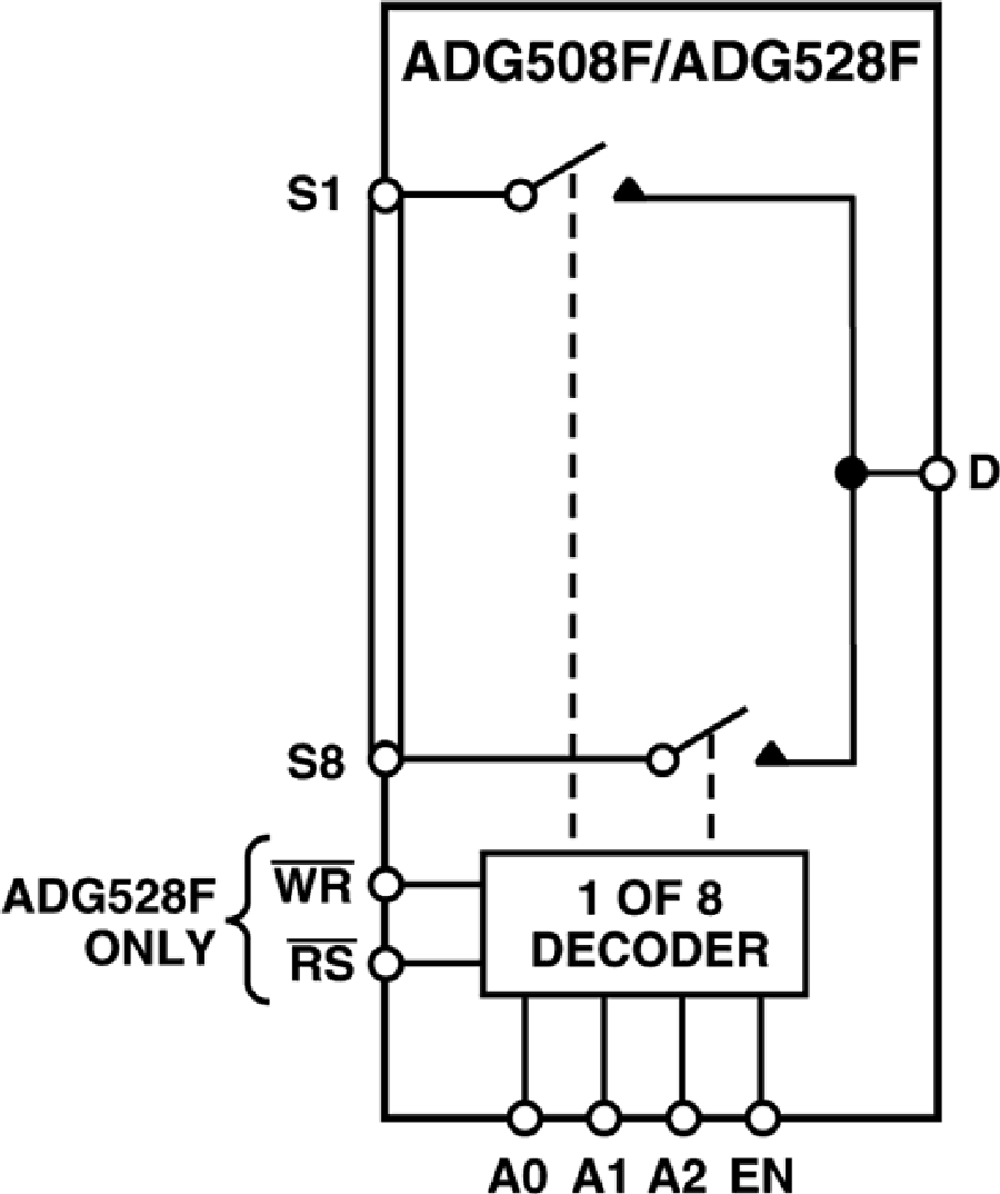 ADG508F是一款CMOS模擬多路復(fù)用器,內(nèi)置8個(gè)單通道,可提供故障保護(hù)。它采用串聯(lián)n溝道、p溝道和n溝道MOSFET結(jié)構(gòu),發(fā)生過(guò)壓或失電時(shí),器件與信號(hào)源均會(huì)受到保護(hù)。該多路復(fù)用器可以承受-40 V至+55 V的連續(xù)過(guò)壓輸入。在故障條件下,多路復(fù)用器輸入(或輸出)表現(xiàn)為開路,泄漏電流只有幾nA。這樣,不但可以保護(hù)多路復(fù)用器及其所驅(qū)動(dòng)的電路,而且可以保護(hù)驅(qū)動(dòng)多路復(fù)用器的傳感器或信號(hào)源。ADG508F根據(jù)3位二進(jìn)制地址線A0、A1和A2所確定的地址,將8路輸入之一切換至公共輸出。該器件提供EN輸入,用來(lái)使能或禁用器件。禁用時(shí),所有通道均關(guān)斷。
