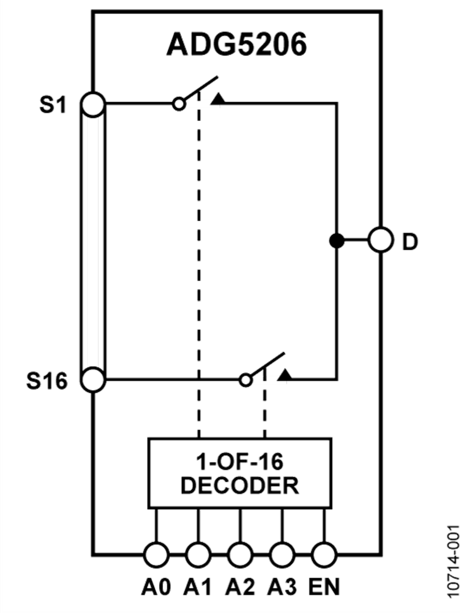 ADG5206是一款單芯片CMOS模擬多路復用器,內置16個單通道。ADG5206根據(jù)4位二進制地址線A0、A1、A2和A3所確定的地址,將16路輸入之一切換至公共輸出。這些開關具有超低電容和電荷注入特性,因而是要求低毛刺和快速建立時間的數(shù)據(jù)采集與采樣保持應用的理想解決方案。較快的開關速度及高信號帶寬,使這些器件適合視頻信號切換應用。