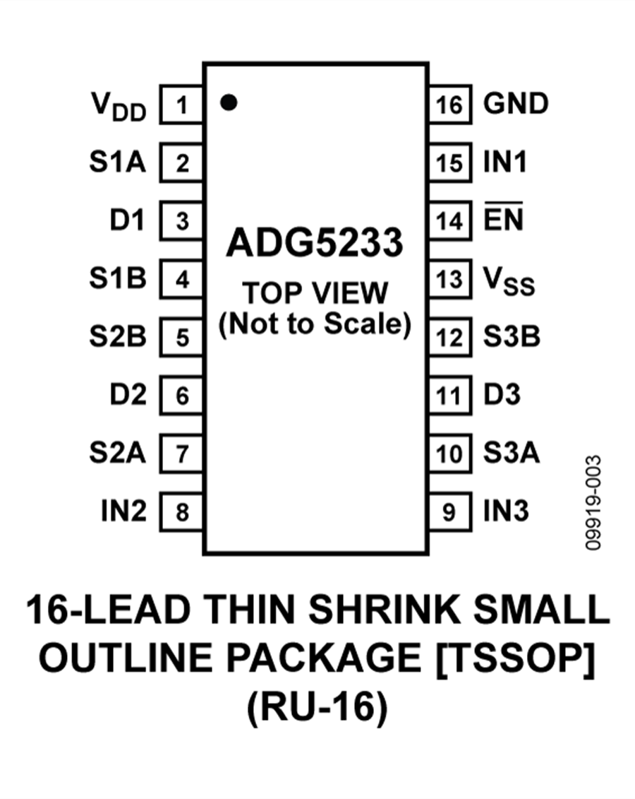 ADG5233和ADG5234均為單芯片工業(yè)CMOS模擬開(kāi)關(guān),分別內(nèi)置三個(gè)/四個(gè)獨(dú)立可選的單刀雙擲(SPDT)開(kāi)關(guān)。所有通道均采用先開(kāi)后合式開(kāi)關(guān),防止開(kāi)關(guān)通道時(shí)發(fā)生瞬時(shí)短路。ADG5233(LFCSP和TSSOP封裝)提供EN EN輸入,用來(lái)使能或禁用器件。禁用時(shí),所有通道均關(guān)斷。