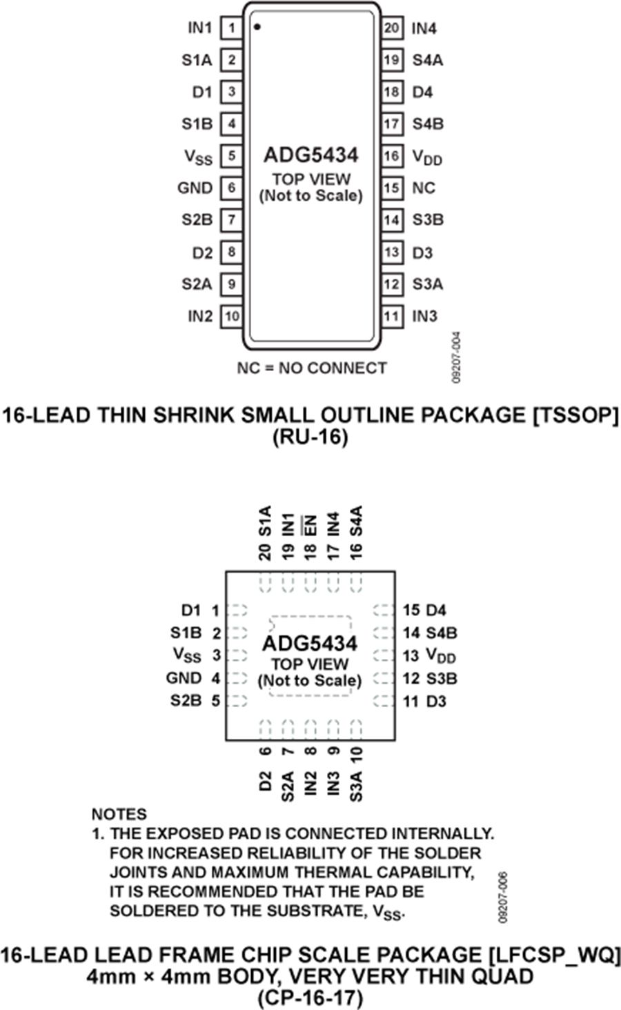 ADG5433和ADG5434均為單芯片工業(yè)CMOS模擬開關(guān),分別內(nèi)置三個/四個獨立可選的單刀雙擲(SPDT)開關(guān)。所有通道均采用先開后合式開關(guān),防止開關(guān)通道時發(fā)生瞬時短路。ADG5433(LFCSP和TSSOP封裝)提供EN輸入,用來使能或禁用器件。禁用時,所有通道均關(guān)斷。