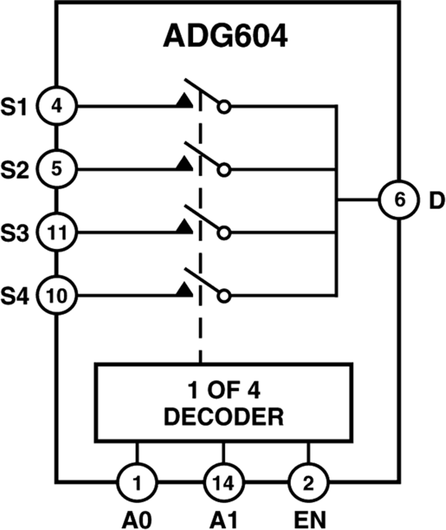 ADG604是一款CMOS模擬多路復用器,內(nèi)置4個單通道。它采用±2.7 V至±5.5 V雙電源或+2.7 V至+5.5 V單電源供電。根據(jù)3位二進制地址線A0、A1和EN所確定的地址,ADG604將四路輸入之一切換至公共輸出D。當EN引腳為邏輯0時,該器件將被禁用。85oC時,ADG604提供1 pC的超低電荷注入和小于250 pA的泄漏電流。導通電阻典型值為85 Ω,通道間導通電阻匹配為8 Ω。它還具有低功耗和高開關(guān)速度特性,采用14引腳TSSOP封裝。