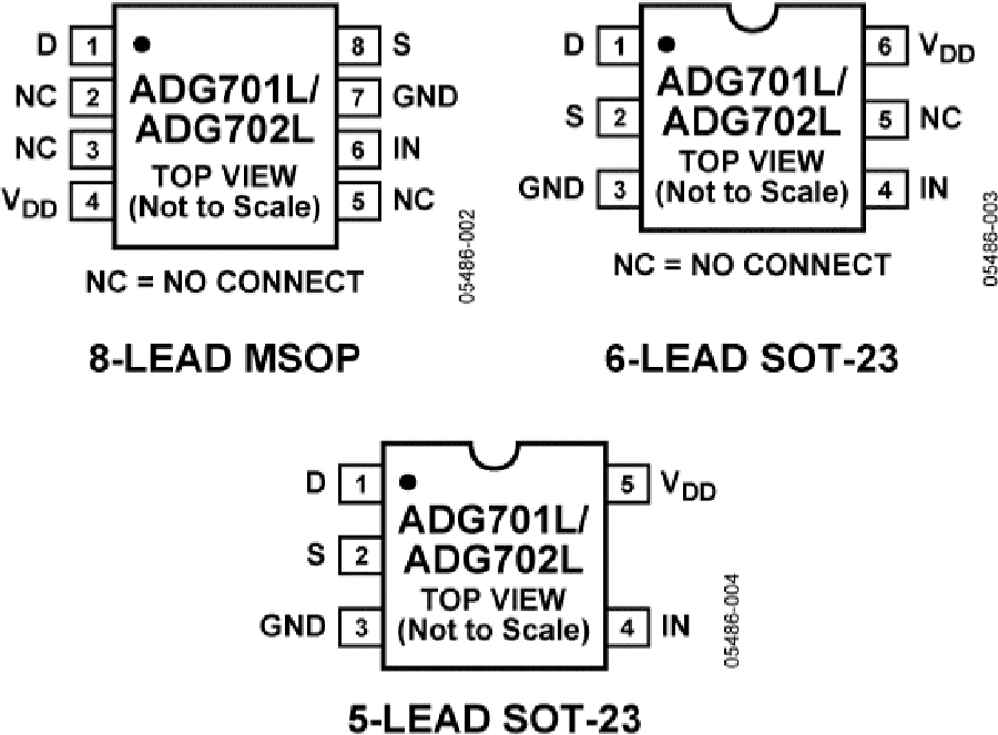 ADG701L/ADG702L提供5引腳SOT-23、6引腳SOT-23和8引腳MSOP三種封裝。