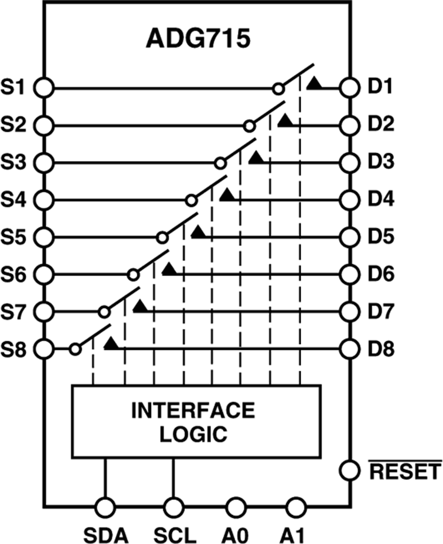 ADG715是一款CMOS、八通道單刀單擲(SPST)開關,通過一個雙線式串行接口進行控制。開關之間的導通電阻匹配嚴格,并且在整個信號范圍內,導通電阻曲線非常平坦。各開關在兩個方向的導電性能相同,輸入信號范圍可擴展至電源電壓范圍。數(shù)據(jù)以8位形式寫入這些器件,每一位對應一個通道。上電時,所有開關均處于斷開狀態(tài),內部寄存器為全零。該器件具有低功耗和2.7 V至5.5 V的工作電壓范圍,因而適合許多應用。ADG715也可以采用±2.5 V雙電源供電。