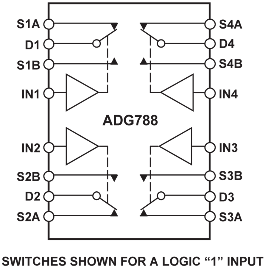 ADG786和ADG788均為低壓、CMOS器件,分別內(nèi)置三個/四個獨立可選的單刀雙擲(SPDT)開關(guān)。這些器件具有低功耗特性,采用1.8 V至5.5 V單電源/±2.5 V雙電源工作,因而非常適合電池供電的便攜式儀表及許多其它應(yīng)用。所有通道均采用先開后合式開關(guān),防止開關(guān)通道時發(fā)生瞬時短路。ADG786提供EN輸入,用來使能或禁用器件。禁用時,所有通道均關(guān)斷。
