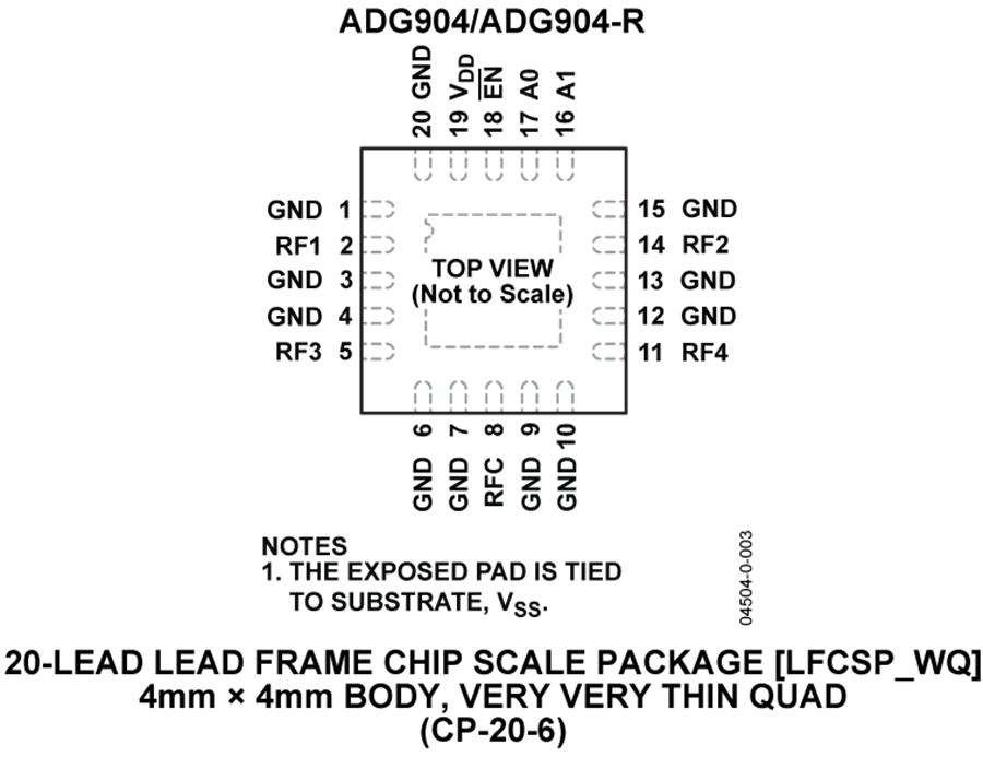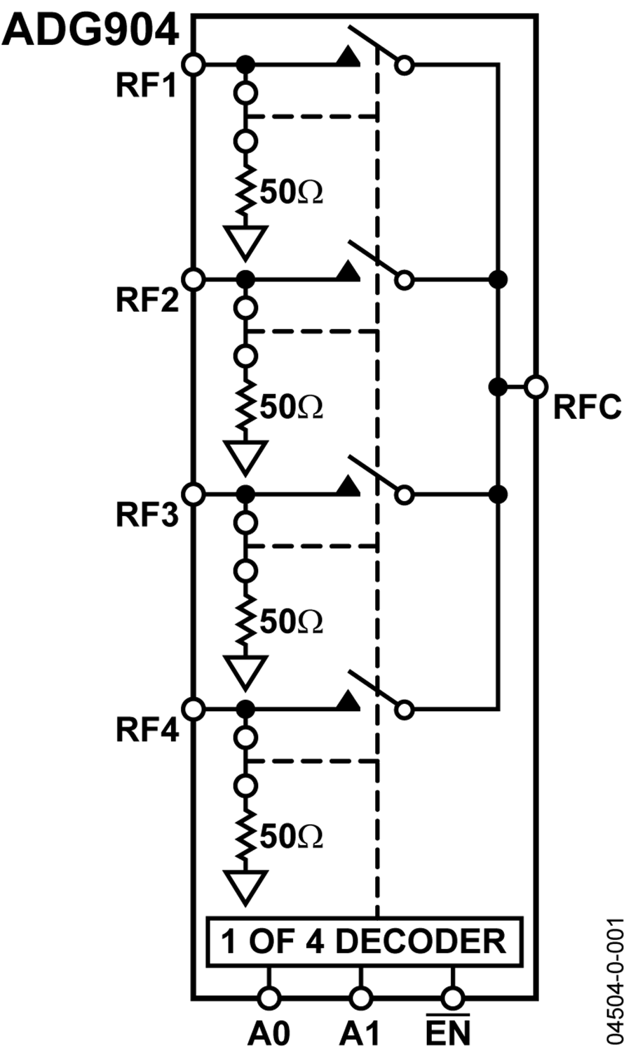 根據(jù)3位二進(jìn)制地址線A0、A1和EN所確定的地址,ADG904和ADG904-R將四路輸入之一切換至公共輸出RFC。當(dāng)EN引腳為邏輯1時(shí),該器件將被禁用。