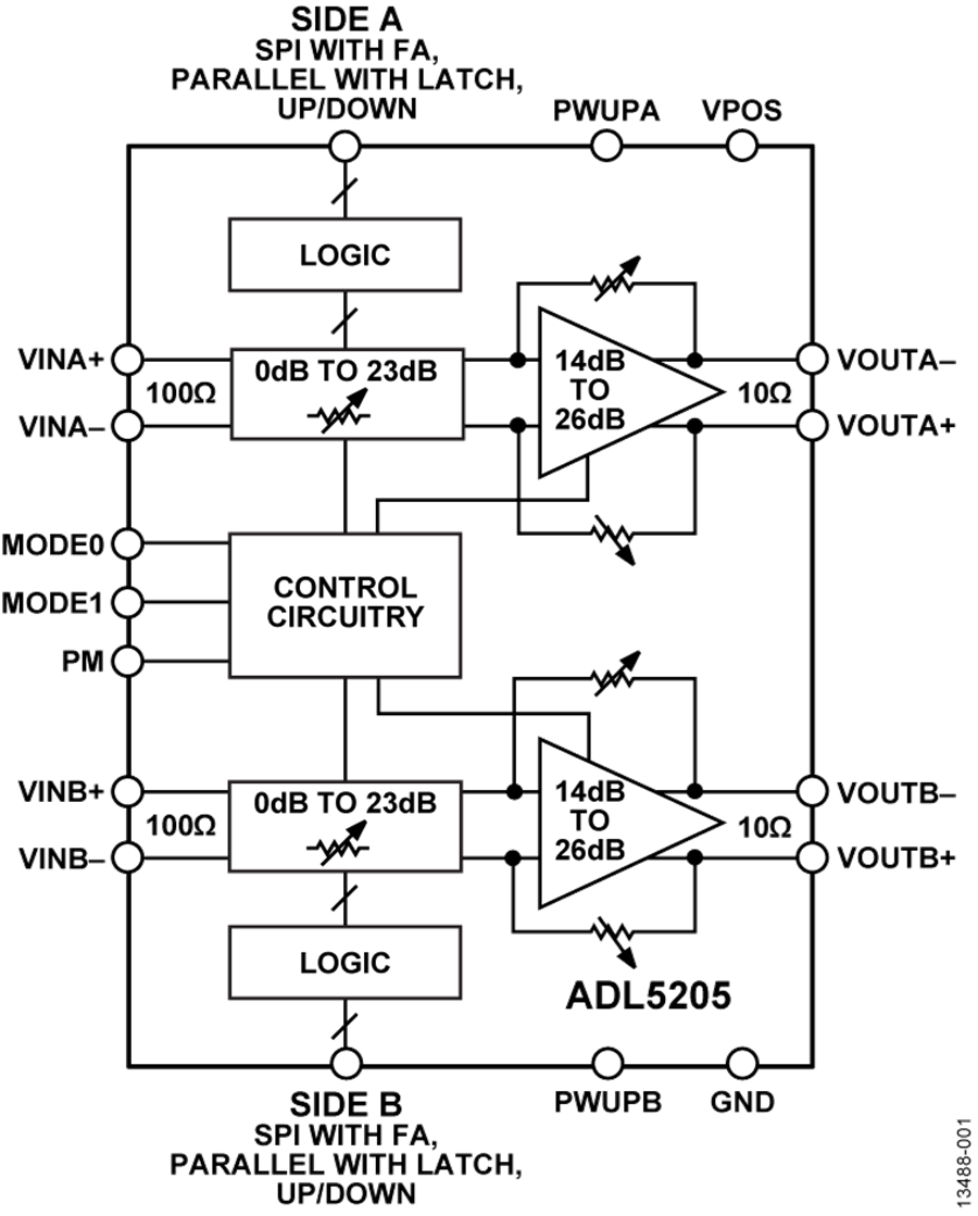 ADL5205的兩個(gè)通道均通過對(duì)PWUPA和PWUPB引腳施加適當(dāng)?shù)倪壿嬰娖絹愍?dú)立上電。ADL5205針對(duì)高性能模式和低功耗模式的典型靜態(tài)電流分別為175 mA和135 mA。禁用時(shí),其功耗僅為14 mA,可以提供出色的輸入-輸出隔離。當(dāng)器件禁用時(shí),增益設(shè)置保持不變。