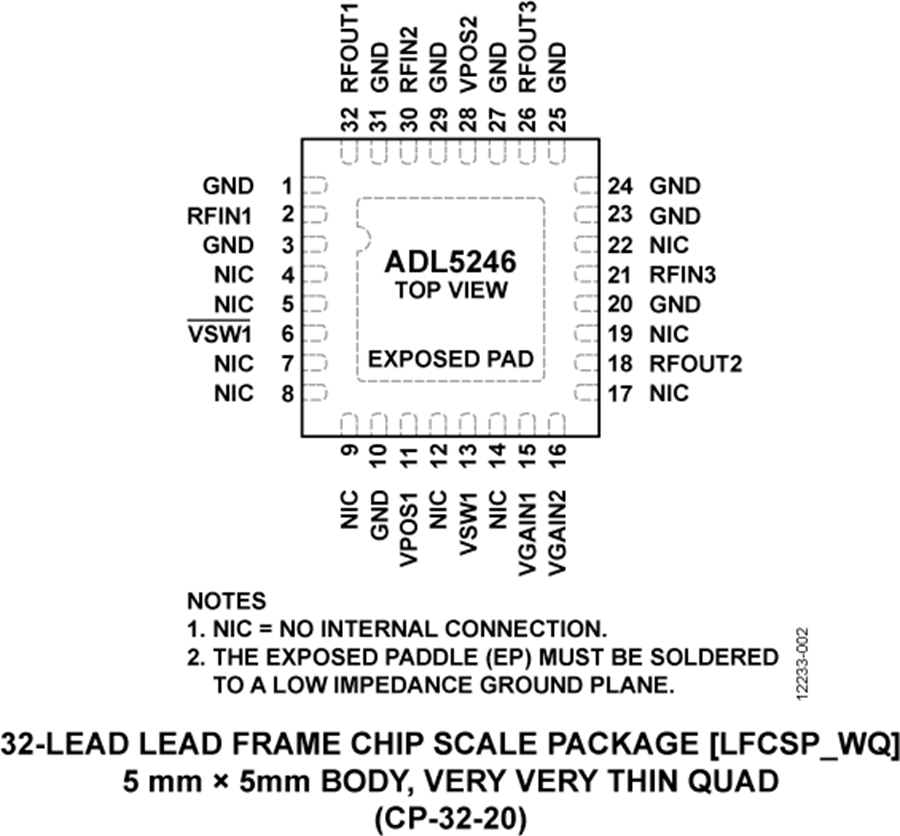 ADL5246采用高級(jí)GaAs工藝制造而成, 采用32引腳、RoHS兼容型5 mm × 5 mm LFCSP封裝,額定工作溫度范圍為?40°C至+105°C。