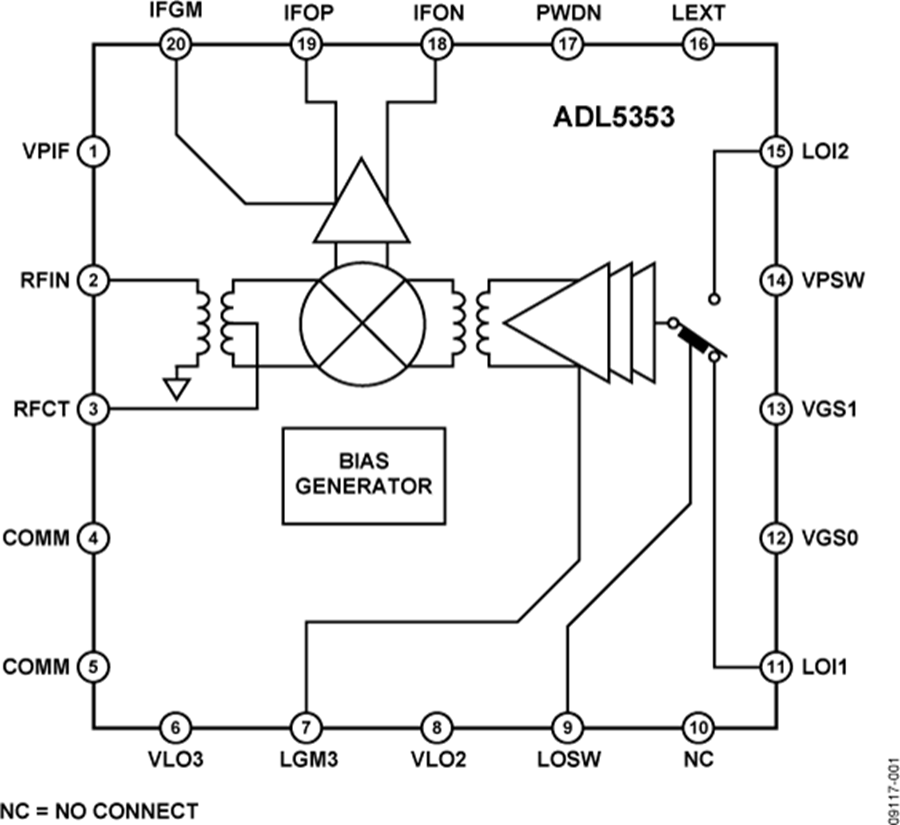 ADL5353提供兩條開關(guān)LO路徑,可用在需要兩個(gè)本機(jī)振蕩器之間進(jìn)行快速切換的TDD應(yīng)用中。LO電流可以通過電阻在外部設(shè)置,使所需性能水平的相應(yīng)直流電流最低。對(duì)于低電壓應(yīng)用,ADL5353能夠以低至3.3 V的電壓工作且電流大幅降低。在低壓下工作時(shí),另外還提供一個(gè)邏輯引腳,可以在需要時(shí)關(guān)斷電路(<200 μA)。