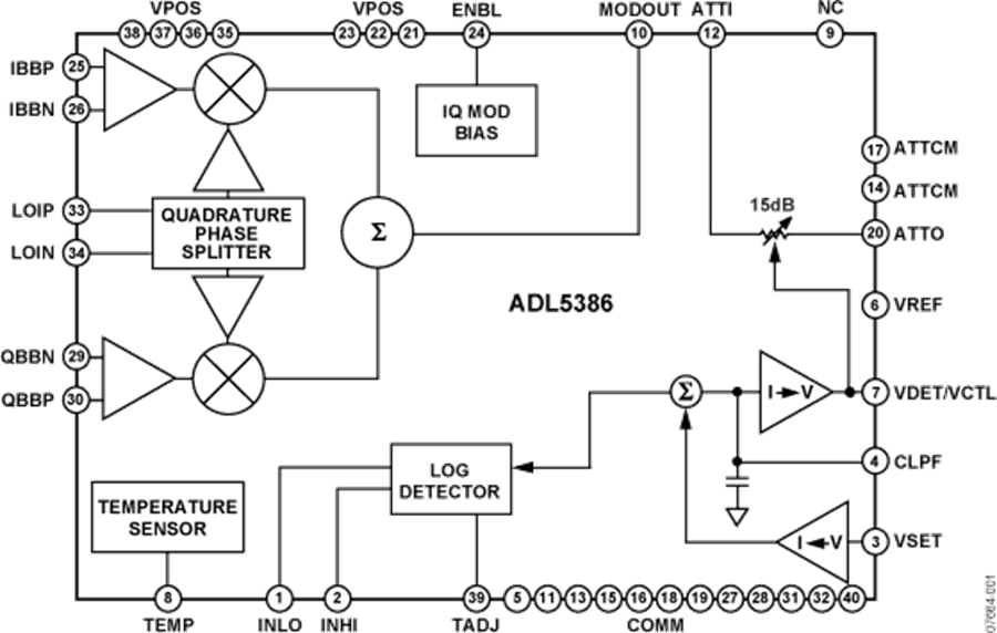 ADL5386采用6 mm × 6 mm 40引腳裸露焊盤LFCSP封裝,工作溫度范圍為–40°C~+85°C。