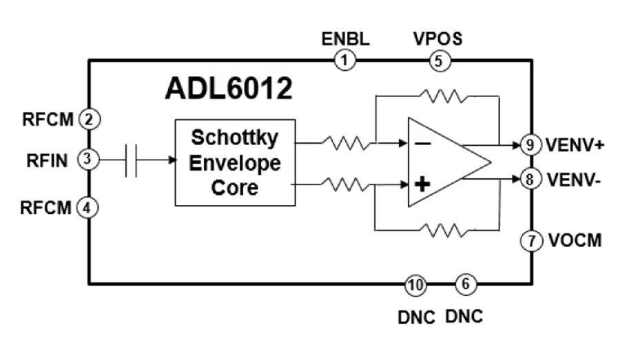 The ADL6012 is a versatile, broadband Envelope detector covering the microwave frequencies from 2 to 43.5 GHz. It provides state-of-the-art accuracy with low power consumption (90 mW) in a simple, easy to use 10-lead LFCSP package. The envelope output is pseudo-differential with 500MHz BW, 100? differential output impedance and variable common-mode capability.