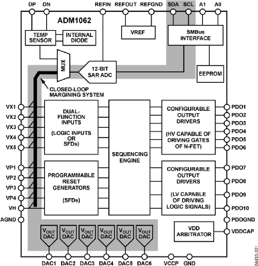 ADM1062 Super Sequencer?超級時(shí)序控制器是一款可配置電源監(jiān)控/時(shí)序控制器件,可針對多電源系統(tǒng)中的電源監(jiān)控和時(shí)序控制提供一種單芯片解決方案。除這些功能外,ADM1062還集成一個(gè)12位ADC和六個(gè)8位電壓輸出DAC。利用這些電路可以實(shí)現(xiàn)閉環(huán)余量微調(diào)系統(tǒng),以便通過更改反饋節(jié)點(diǎn),或利用DAC輸出更改DC-DC轉(zhuǎn)換器的基準(zhǔn)電壓來實(shí)現(xiàn)電源調(diào)整。只需用極少的外部元件便可執(zhí)行電源余量微調(diào)。余量微調(diào)環(huán)路可以用于生產(chǎn)期間的電路板在線測試(例如,驗(yàn)證電路板在電源電壓比標(biāo)稱電壓低5%時(shí)的功能),也可以動態(tài)使用,以便精確控制DC-DC轉(zhuǎn)換器的輸出電壓。