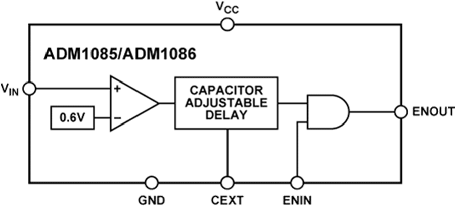 ADM1085-ADM1088均為Simple Sequencing?簡(jiǎn)單時(shí)序控制電路,用來(lái)在多電源系統(tǒng)上電時(shí)提供時(shí)間延遲,使各穩(wěn)壓器依序啟用。當(dāng)?shù)谝粋€(gè)穩(wěn)壓器的輸出電壓達(dá)到預(yù)設(shè)閾值時(shí),就會(huì)開(kāi)始一段時(shí)間延遲,延遲結(jié)束后才會(huì)發(fā)出使能信號(hào)允許后續(xù)穩(wěn)壓器上電??梢詫⑷我鈹?shù)量的這些器件與穩(wěn)壓器級(jí)聯(lián),實(shí)現(xiàn)對(duì)多個(gè)電源的時(shí)序控制。閾值電平可以借助一對(duì)采用分壓器配置的外部電阻設(shè)置。通過(guò)選擇適當(dāng)?shù)碾娮柚?,可以調(diào)節(jié)閾值以監(jiān)控低至0.6 V的電壓。