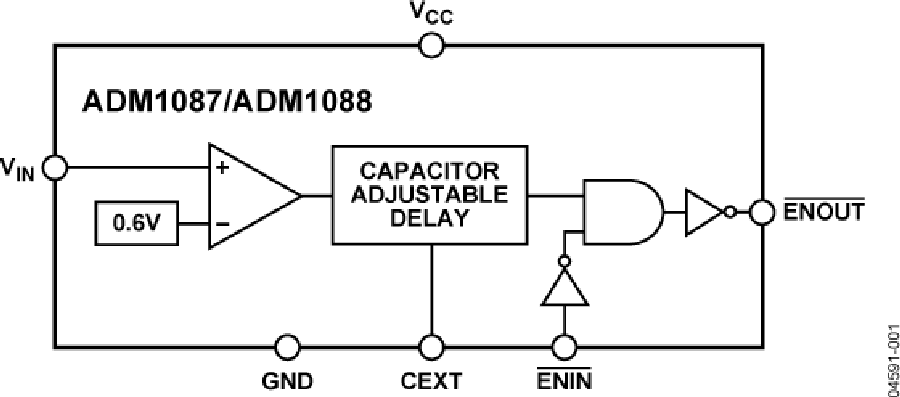 所有四款器件均具有專用使能輸入引腳,允許從外部控制穩(wěn)壓器的輸出信號(hào)。對(duì)于ADM1085和ADM1086,該引腳為高電平有效輸入(ENIN);對(duì)于ADM1087和ADM1088則為低電平有效輸入(ENIN)。