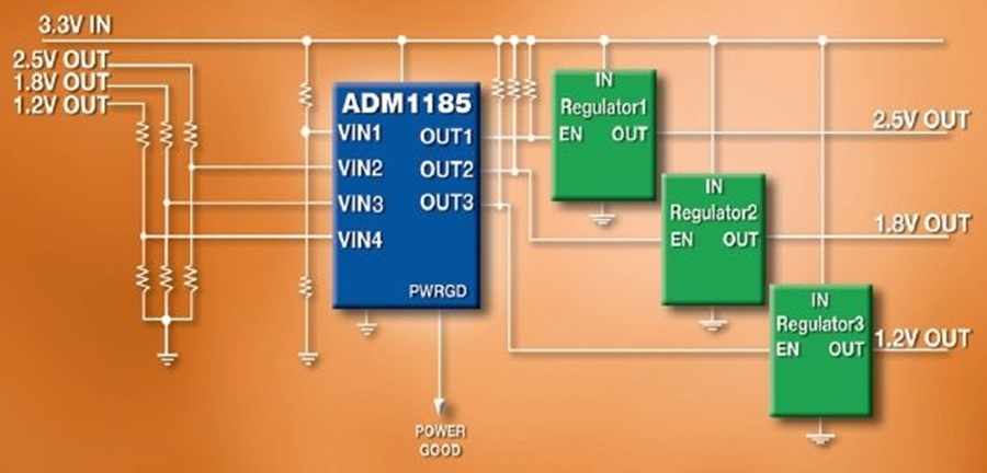 ADM1185具有四路開漏輸出。在典型配置中,用OUT1至OUT3實(shí)現(xiàn)電源使能,而PWRGD則為共用的電源正常信號(hào)輸出,指示所有受監(jiān)控電源的狀態(tài)。