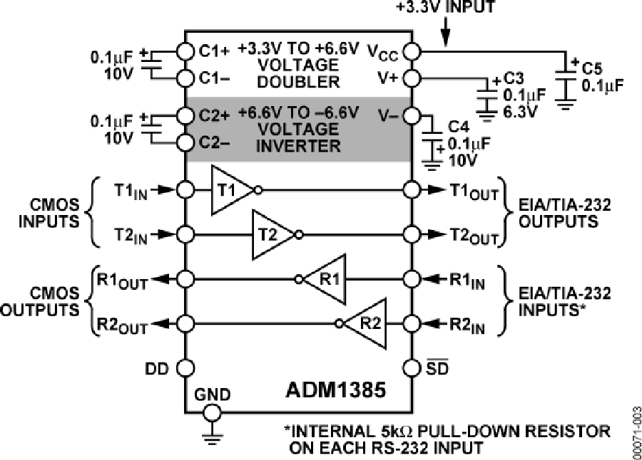 ADM3202/ADM3222/ADM1385均為高速、雙通道RS232/V.28接口器件,采用+3.3 V單電源供電。這些器件具有低功耗和關(guān)斷特性(ADM3222/ADM1385),非常適合電池供電的便攜式儀表使用。ADM3202/ADM3222/ADM1385均符合EIA-232E和CCITT V.28規(guī)范,數(shù)據(jù)速率最高可達(dá)230 kbps。倍壓器/反相器使用四個(gè)外部0.1 μF電荷泵電容,因而該器件可以采用+3.3 V單電源供電。
