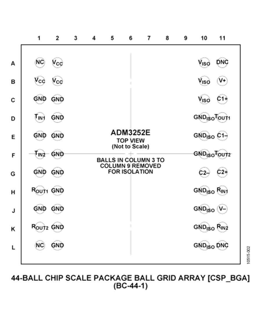 ADM3252E符合EIA/TIA-232E和ITU-T V.28規(guī)范,數(shù)據(jù)速率最高可達(dá)460 kbps。倍壓/負(fù)壓轉(zhuǎn)換器使用四個(gè)0.1 μF外部電荷泵電容,這使得該器件可以采用3.3 V或5 V單電源供電。ADM3252E采用44引腳、芯片級(jí)球柵陣列(CSP_BGA)封裝,額定工作溫度范圍為?40°C至+85°C。