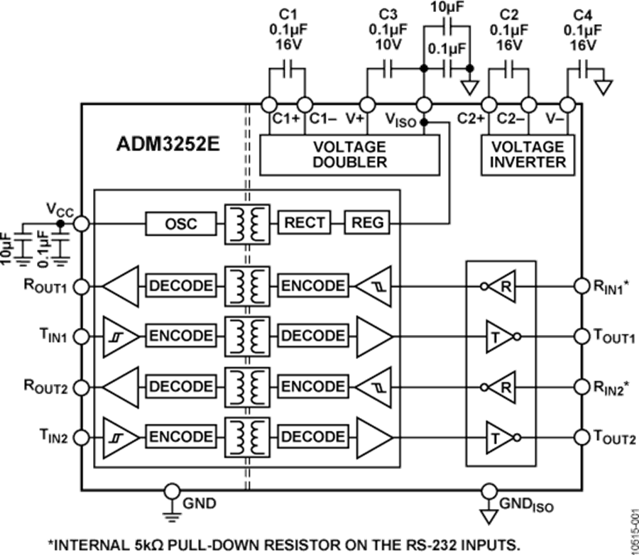 ADM3252E是一款高速、2.5 kV 完全隔離、雙通道 RS-232/V.28 收發(fā)器,采用3.3 V或5 V單電源供電。由于RIN1、RIN2、TOUT1和 TOUT2 引腳提供高壓ESD保護(hù),因此ADM3252E非常適合在惡劣的電氣環(huán)境中工作,或頻繁插拔RS-232電纜的場(chǎng)合。利用isoPower?的集成隔離電源,ADM3252E提供四個(gè)獨(dú)立的隔離通道。無(wú)需使用單獨(dú)的隔離DC-DC轉(zhuǎn)換器。該器件采用ADI公司的芯片級(jí)變壓器iCoupler? 技術(shù),能夠隔離邏輯信號(hào)和集成式DC-DC轉(zhuǎn)換器。因此該器件可提供完全隔離的解決方案。