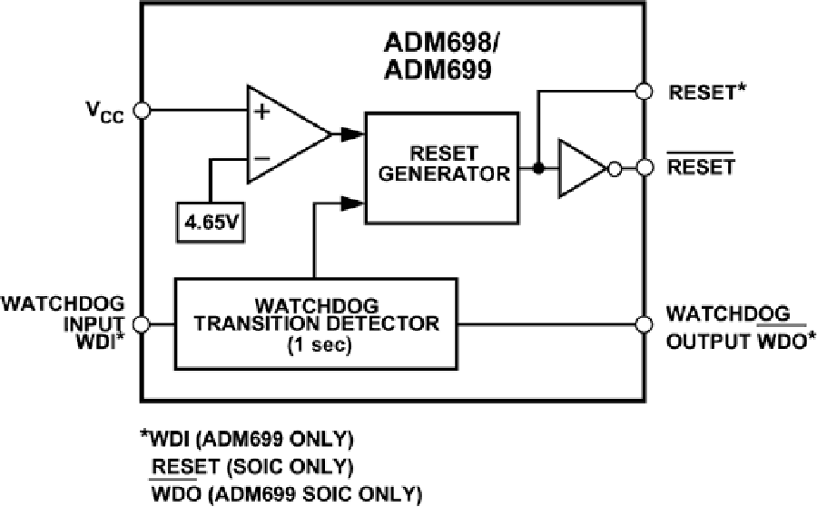 兩款器件均提供8引腳塑料DIP和16引腳SOIC兩種封裝。16引腳SOIC含有附加輸出RESET(無反相)和看門狗輸出WDO(僅限ADM699)。
