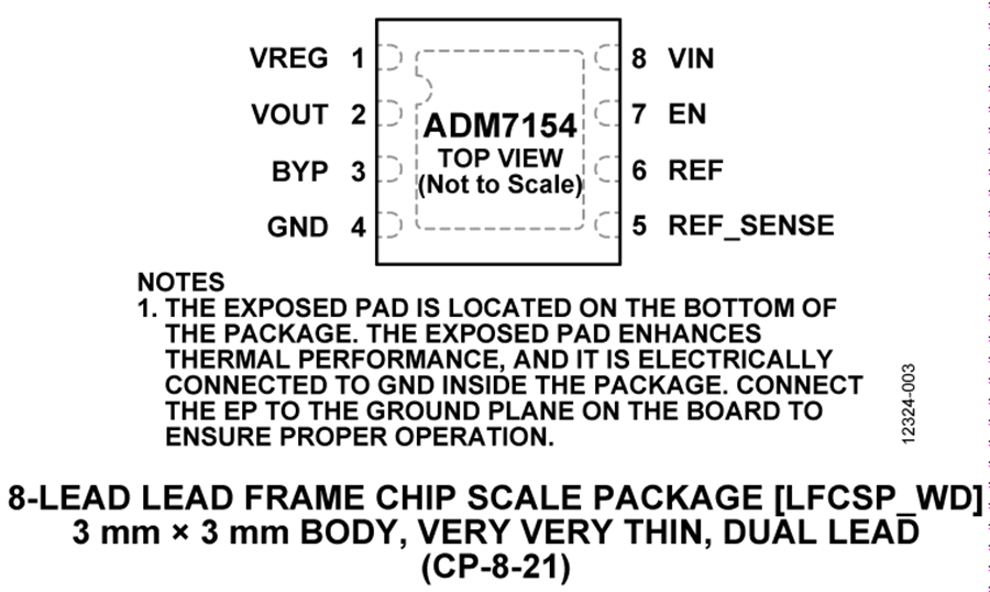 ADM7154穩(wěn)壓器的典型輸出噪聲為0.9 μV rms(100 Hz至100 kHz,固定輸出電壓),10 kHz至1 MHz的噪聲頻譜密度為1.5 nV/√Hz。 ADM7154提供8引腳、3 mm x 3 mm LFCSP封裝和8引腳SOIC封裝,不僅非常緊湊,而且還具有出色的散熱性能,適合要求最大600 mA輸出電流的薄型、小尺寸應(yīng)用。