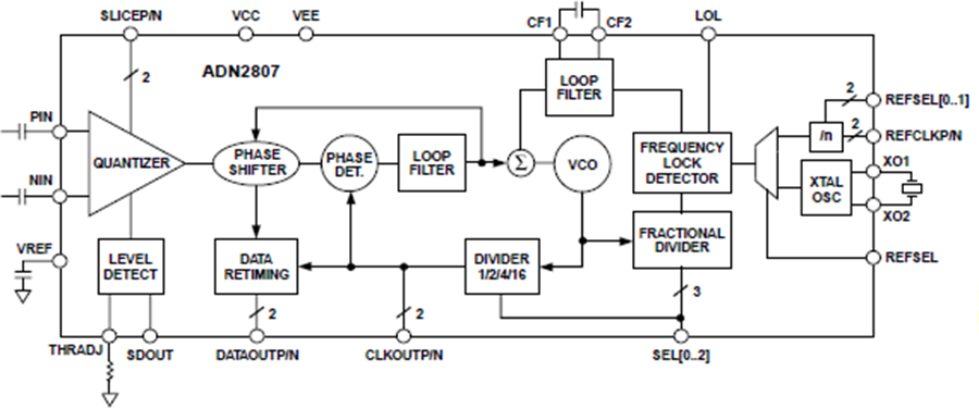 該器件主要用于WDM系統(tǒng),可以結(jié)合外部參考時(shí)鐘或配有外部晶振的片內(nèi)振蕩器使用。ADN2807同時(shí)支持本有速率和15/14速率數(shù)字包裝器,無需更改參考時(shí)鐘。