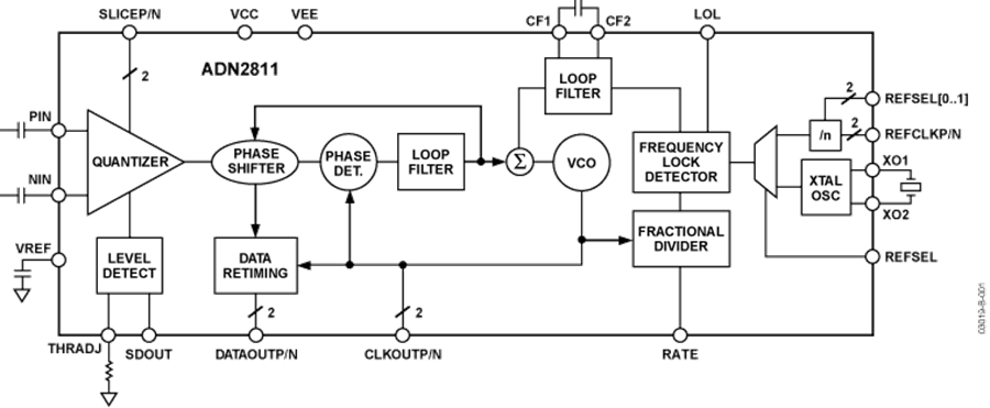 該器件主要用于WDM系統(tǒng),可以結(jié)合外部參考時(shí)鐘或配有外部晶振的片內(nèi)振蕩器使用。ADN2811同時(shí)支持2.48 Gbps和2.66 Gbps數(shù)字包裝器速率,無需更改參考時(shí)鐘。