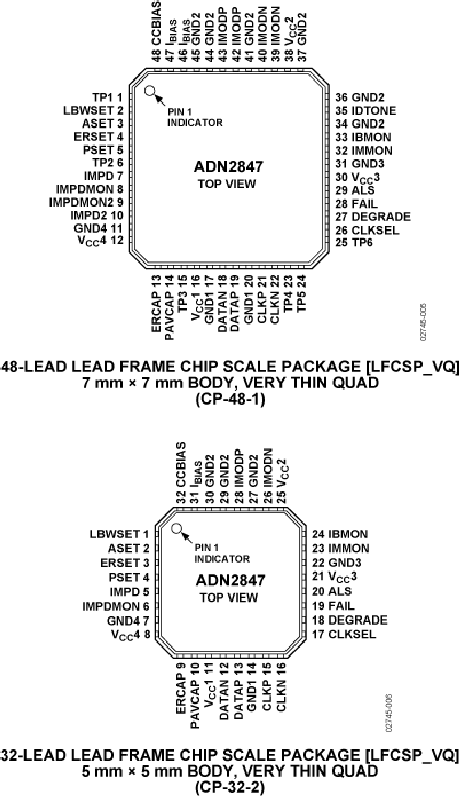ADN2847的額定溫度范圍為?40°C至+85°C,提供48引腳和32引腳兩種LFCSP封裝。
