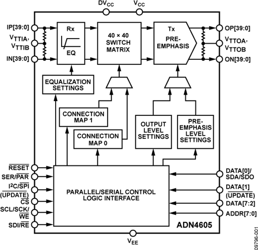 The ADN4605 is a 40 × 40 asynchronous, protocol agnostic, digital crosspoint switch, with 40 differential PECL/CML-compatible inputs and 40 differential programmable CML outputs.The ADN4605 is optimized for NRZ signaling with data rates of up to 4.25 Gbps per port. Each port offers adjustable levels of input equalization, programmable output swing, and output preemphasis/deemphasis.