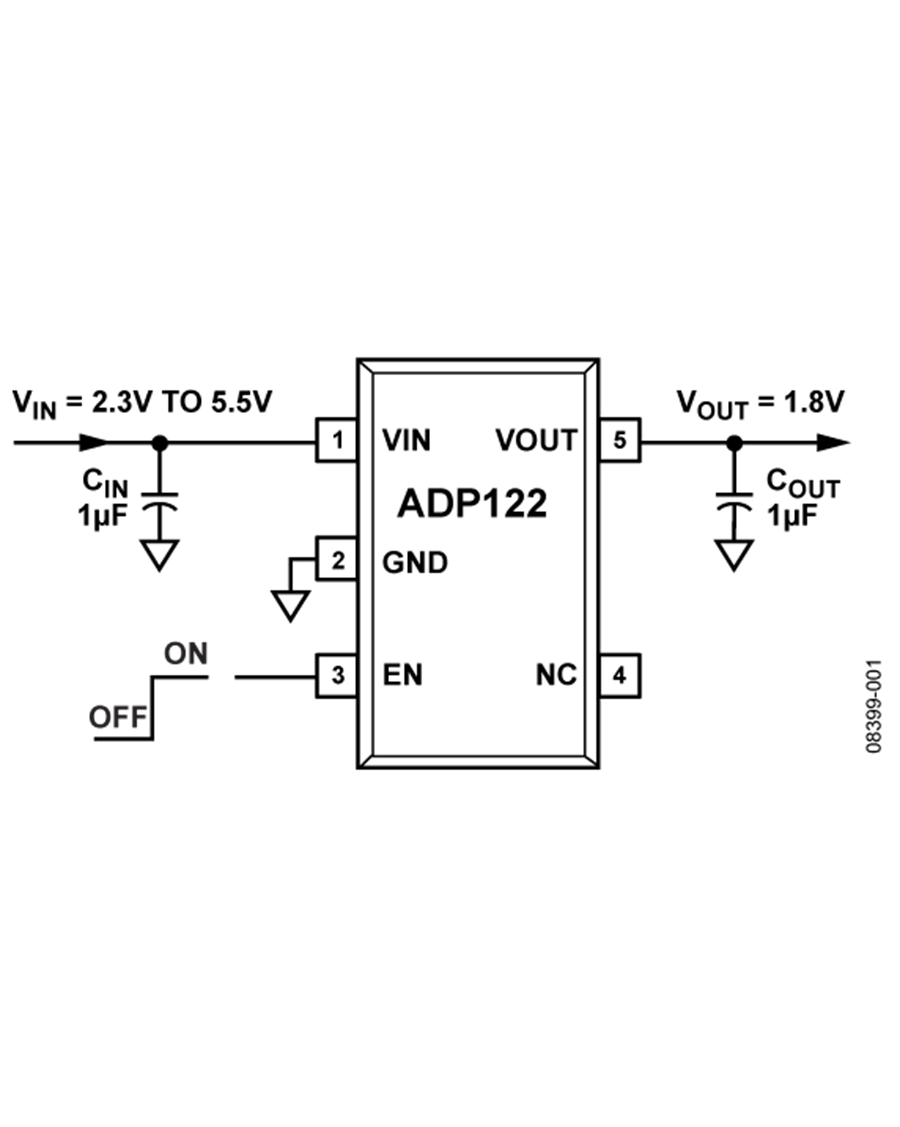 ADP122/ADP123具有內(nèi)部軟啟動(dòng)功能,啟動(dòng)時(shí)間恒定為350 μs。短路保護(hù)和熱過載保護(hù)電路可以防止器件在不利條件下受損。ADP122/ADP123采用5引腳小型TSOT封裝,和6引腳LFCSP封裝,是適合各種便攜式應(yīng)用的業(yè)界最小尺寸解決方案。
