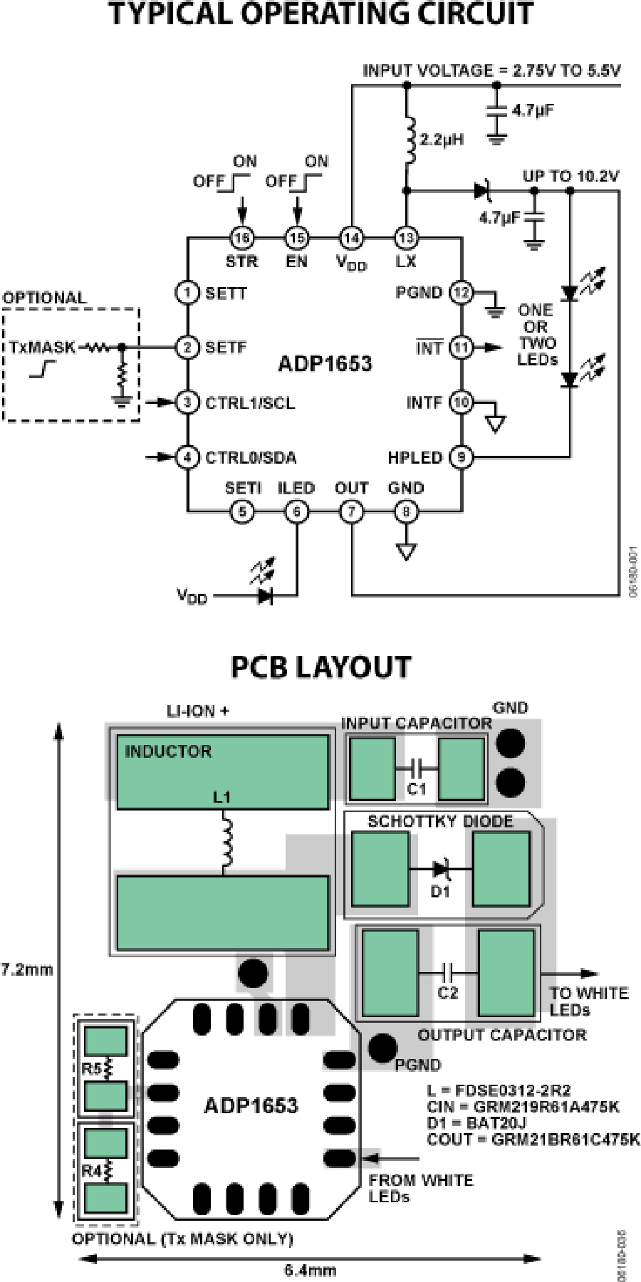 ADP1653解決方案在I2C模式僅需要4個外部元件,占用空間為6.4 mm × 7.2 mm。該器件具有多個安全特性,如軟啟動、閃光燈超時、輸出電流限制、熱保護以及過壓保護等。