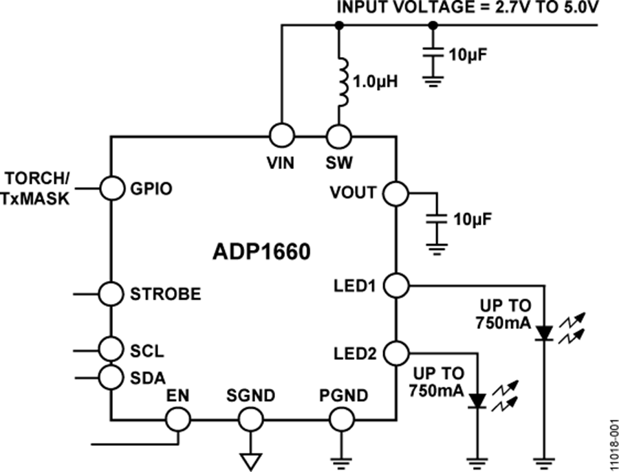 ADP1660是一款用于高分辨率照相手機(jī)的超小尺寸、高效率雙路白色LED閃光燈驅(qū)動(dòng)器,可在低光照環(huán)境下提高圖像和視頻質(zhì)量。這款器件集成了一個(gè)可編程1.5 MHz或3.0 MHz同步電感升壓轉(zhuǎn)換器、一個(gè)I2C兼容接口和兩個(gè)750 mA電流源。由于這款驅(qū)動(dòng)器具有高開關(guān)頻率,因而可以采用1 mm高、低成本、1 μH功率小電感,并聯(lián)電流源允許LED陰極接地,以改善散熱性能,實(shí)現(xiàn)低EMI和緊湊布局。這款LED驅(qū)動(dòng)器在整個(gè)電池電壓范圍內(nèi)都具有極高的效率,可以最大限度地提高輸入電源到LED電源的轉(zhuǎn)換效果,并使閃光消耗的電池電流降至最低??删幊讨绷麟姵叵蘖鞴δ芸砂踩厥顾蠰ED VF和電池電壓條件下的LED電流達(dá)到最大。
