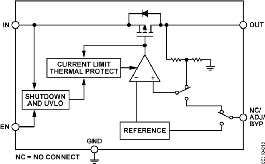 ADP1710/ADP1711經(jīng)過優(yōu)化,利用1 μF小型陶瓷輸出電容可實(shí)現(xiàn)穩(wěn)定工作,同時(shí)提供良好的瞬態(tài)性能,而占用的電路板空間則極小。使能引腳控制這兩款器件的輸出電壓。此外還具有一個(gè)欠壓閉鎖電路;如果輸入降至最小閾值以下,閉鎖電路將禁用穩(wěn)壓器。