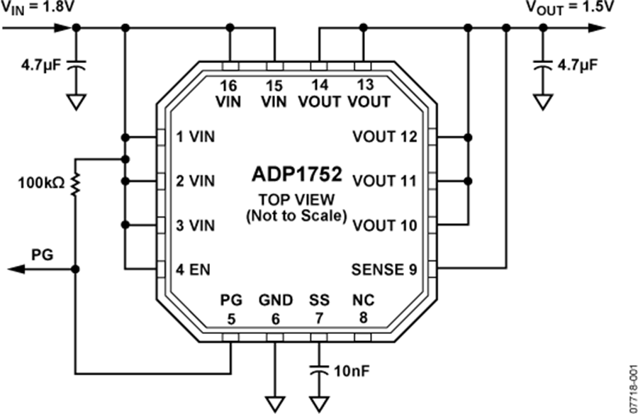 具有軟啟動特性,提供7種固定輸出電壓選項:0.75 V至2.5V (ADP1752)