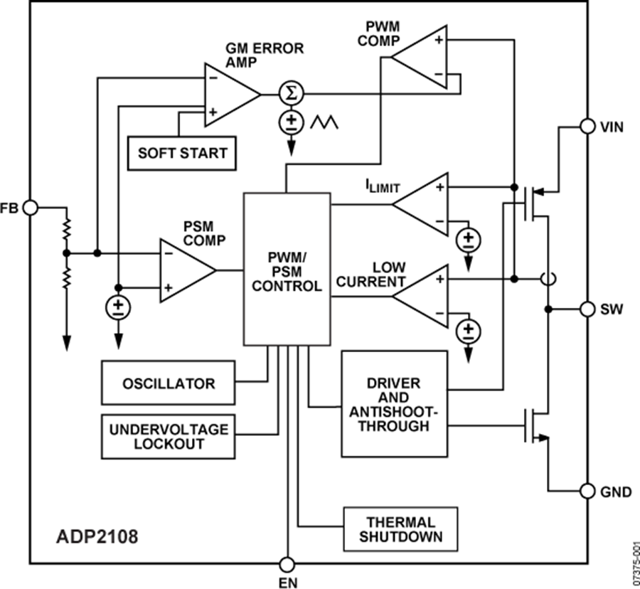 ADP2108可提供3.3V、3.0V、2.5、2.3V、1.8V、1.5、1.3V、1.2V、1.1V及1.0V的固定輸出電壓。為了實(shí)現(xiàn)最少的外部器件數(shù)量及高效率,所有版本均內(nèi)置電源開關(guān)和同步整流器。ADP2108內(nèi)置一個軟啟動功能并具有內(nèi)部補(bǔ)償機(jī)制。在邏輯控制關(guān)斷期間,輸入是與輸出斷開的,輸入源漏電流小于0.1A。其它的關(guān)鍵性能包括防止深度電池放電的欠壓閉鎖以及防止在啟動時輸入電流過沖的軟啟動。ADP2108采用5焊球WLCSP封裝。