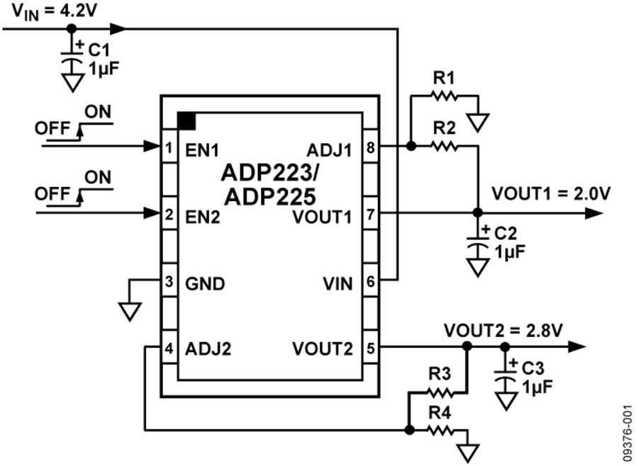 ADP223/ADP225 均為300 mA可調(diào)雙路輸出電壓調(diào)節(jié)器,ADP222/ADP224 則是固定雙路輸出電壓調(diào)節(jié)器,這些器件集高電源抑制比(PSRR)、低噪聲、低靜態(tài)電流和低壓差于一體,非常適合對(duì)性能和電路板空間要求嚴(yán)苛的無(wú)線(xiàn)應(yīng)用。ADP222/ADP223/ADP224/ADP225 的低靜態(tài)電流、低壓差和寬輸入電壓范圍可延長(zhǎng)便攜式設(shè)備的電池使用時(shí)間。