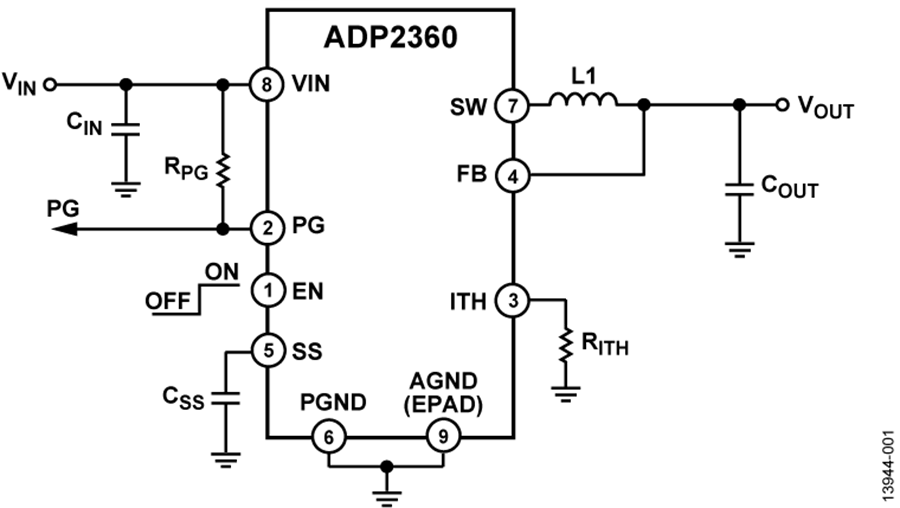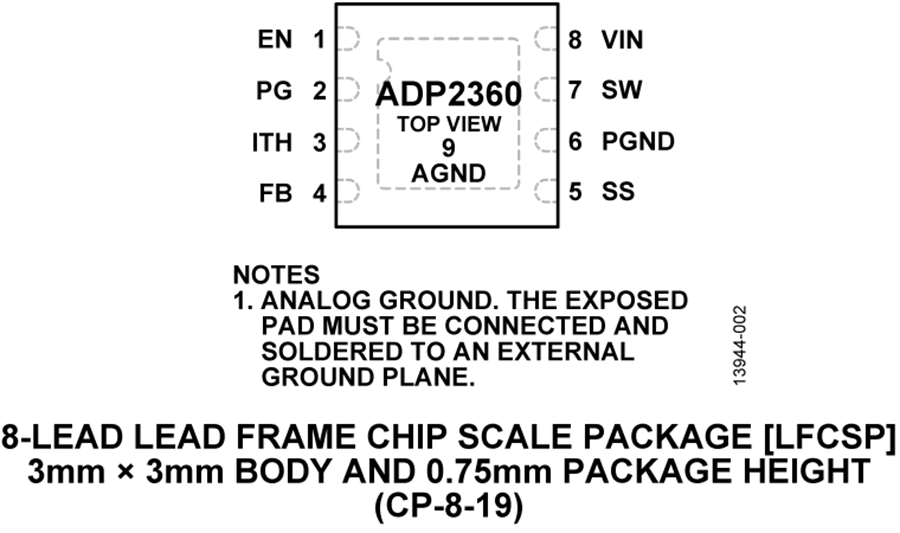 ADP2360無需外部補償,而針對固定輸出電壓選項的解決方案至少需要三個外部元件。ADP2360采用3 mm × 3 mm、8引腳LFCSP封裝,工作結(jié)溫范圍為?40°C至+125℃。