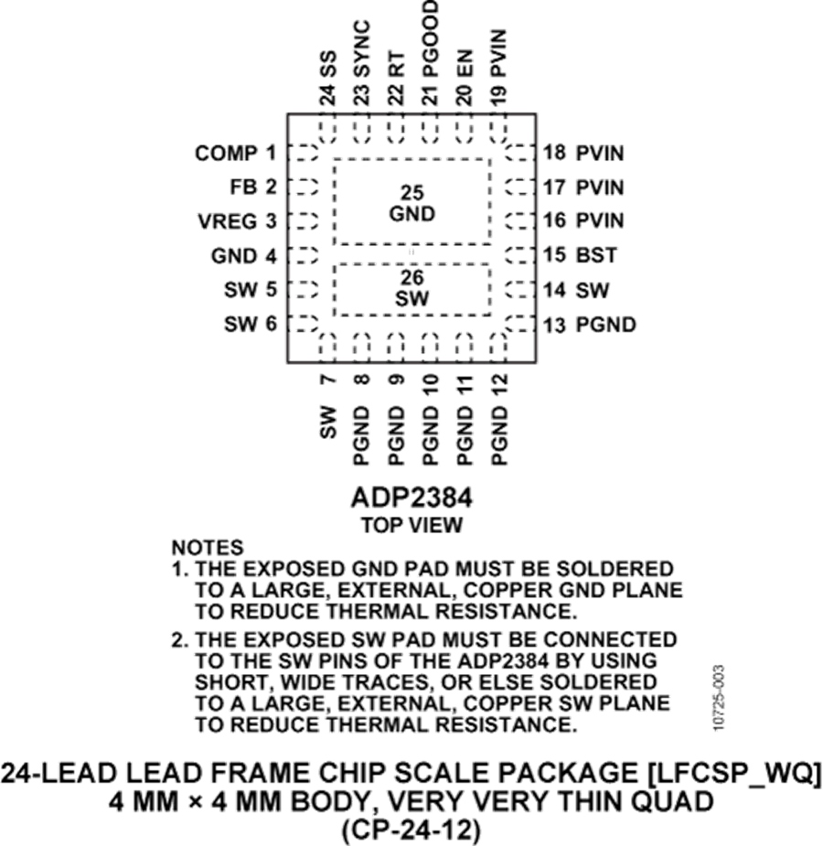 ADP2384在-40°C至+125°C的結(jié)溫范圍內(nèi)工作,采用24引腳4 mm × 4 mm LFCSP封裝。