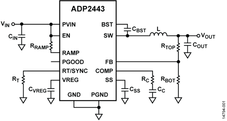 ADP2443針對需要高效率和設計靈活性的高性能應用。外部補償和可調(diào)軟啟動功能提供設計靈活性。電源良好輸出和精密使能輸入提供簡單可靠的電源時序。
