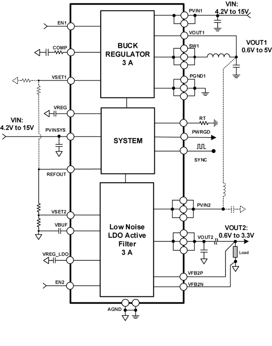 The buck regulator is optimized to operate at high output currents up to 3 A. The LDO is capable of a maximum output current of 3 A and is designed to operate efficiently with low headroom voltage while maintaining high power supplyrejection for frequencies as high as 1MHz.