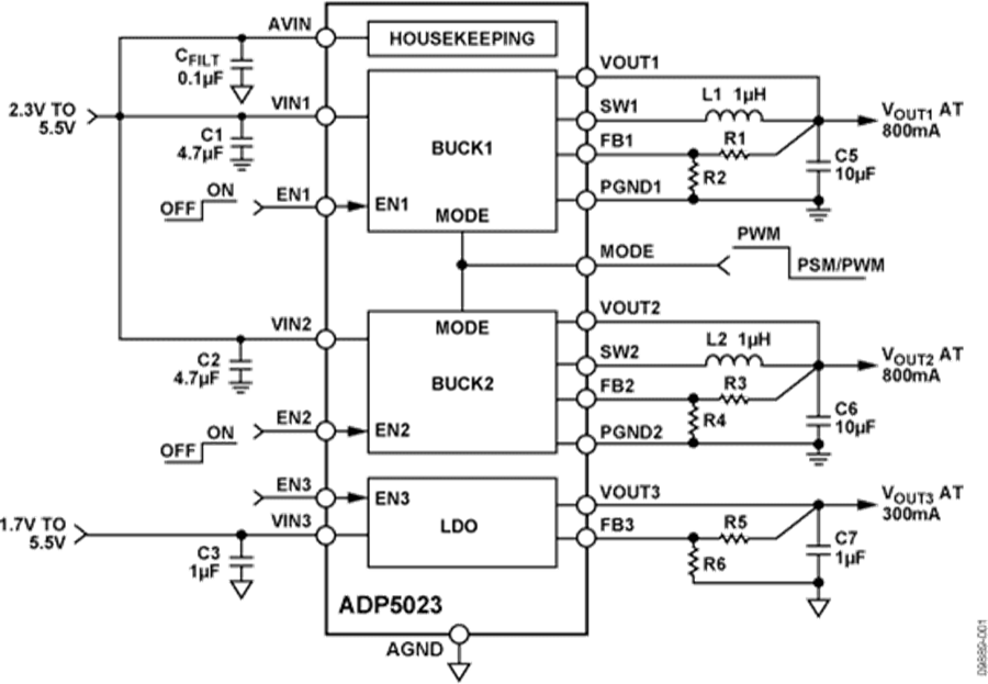 ADP5023在一個(gè)24引腳4 mm × 4 mm小型LFCSP封裝中集成了兩個(gè)高性能降壓調(diào)節(jié)器和一個(gè)低壓差調(diào)節(jié)器(LDO),可滿足嚴(yán)苛的性能和電路板空間要求。降壓調(diào)節(jié)器的高開(kāi)關(guān)頻率支持小型多層外部器件,并使電路板空間降至最小。當(dāng)MODE引腳設(shè)置為高電平時(shí),降壓調(diào)節(jié)器以強(qiáng)制PWM模式工作。當(dāng)MODE引腳設(shè)置為低電平時(shí),如果負(fù)載電流高于預(yù)定義閾值,則降壓調(diào)節(jié)器以PWM模式工作;當(dāng)負(fù)載電流降至預(yù)定義閾值以下時(shí),調(diào)節(jié)器以省電模式(PSM)工作,以便改善輕負(fù)載效率。