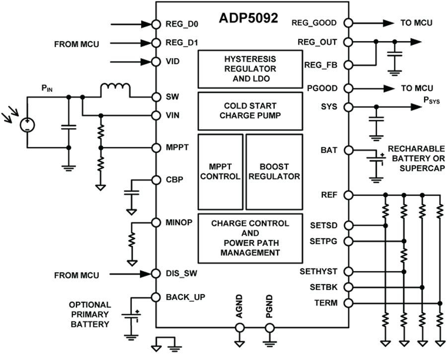 The ADP5091/ADP5092是一款智能集成式能量采集納米電源管理解決方案,可轉(zhuǎn)換來自PV電池或熱電發(fā)生器(TEG)的直流電源。該器件可對儲能元件(如可充電鋰離子電池、薄膜電池、超級電容和傳統(tǒng)電容)進行充電,并對小型電子設(shè)備和無電池系統(tǒng)上電。