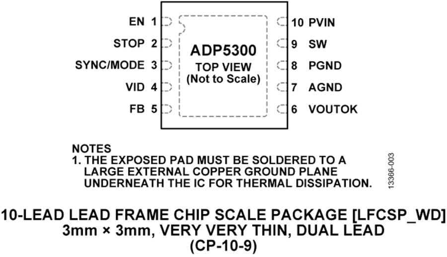 ADP5300采用10引腳、3 mm × 3 mm LFCSP封裝,額定工作溫度范圍為?40°C至+125°C結(jié)溫范圍。
