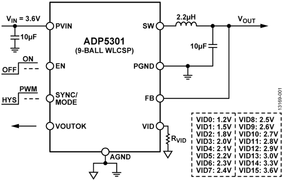 ADP5301的輸入啟動電壓范圍為2.15 V至6.50 V,因此可使用多個堿性或NiMH、鋰離子電池或其他電源。 0.8 V至5.0 V輸出電壓通過外部VID電阻和工廠熔絲可選。 整個解決方案僅需四個小型外部元件。