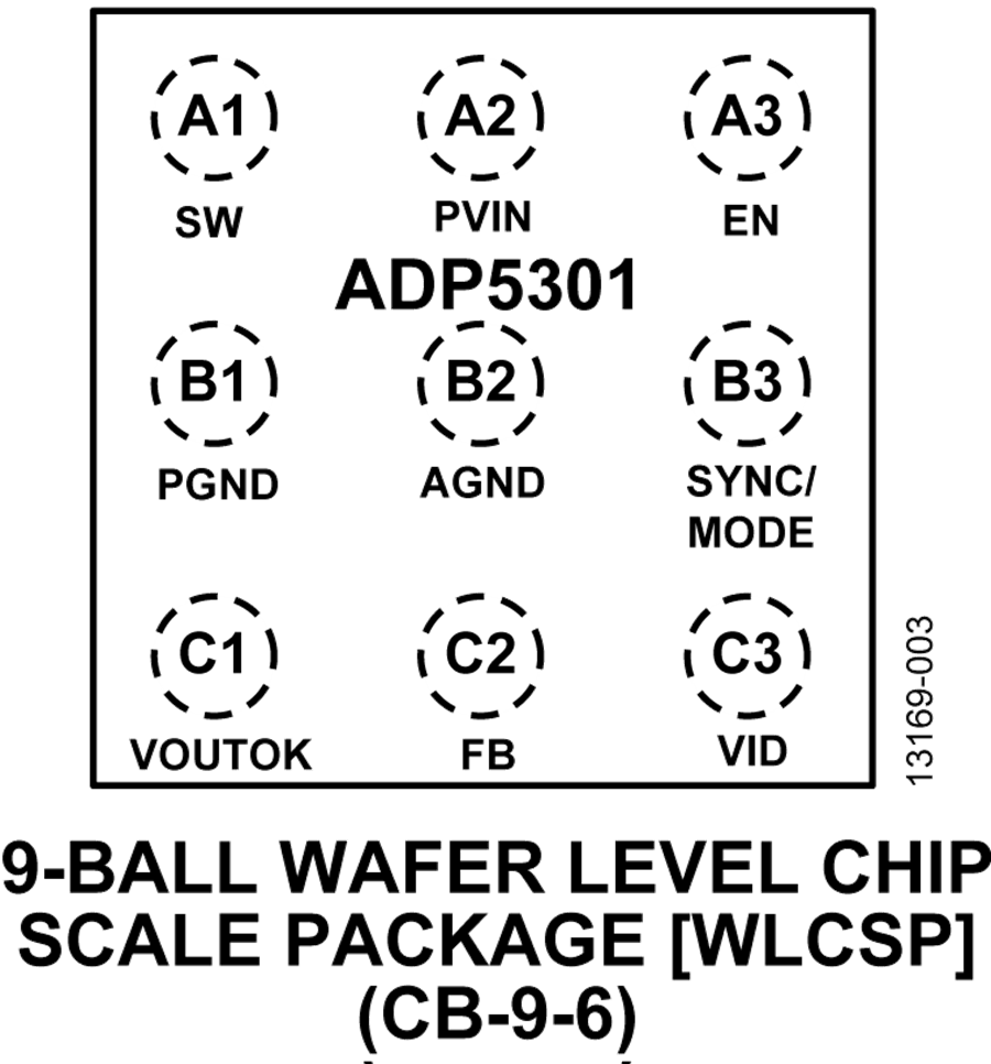 ADP5301采用9引腳、1.65 mm × 1.87 mm WLCSP封裝,額定工作溫度范圍為?40°C至+125°C的結溫范圍。